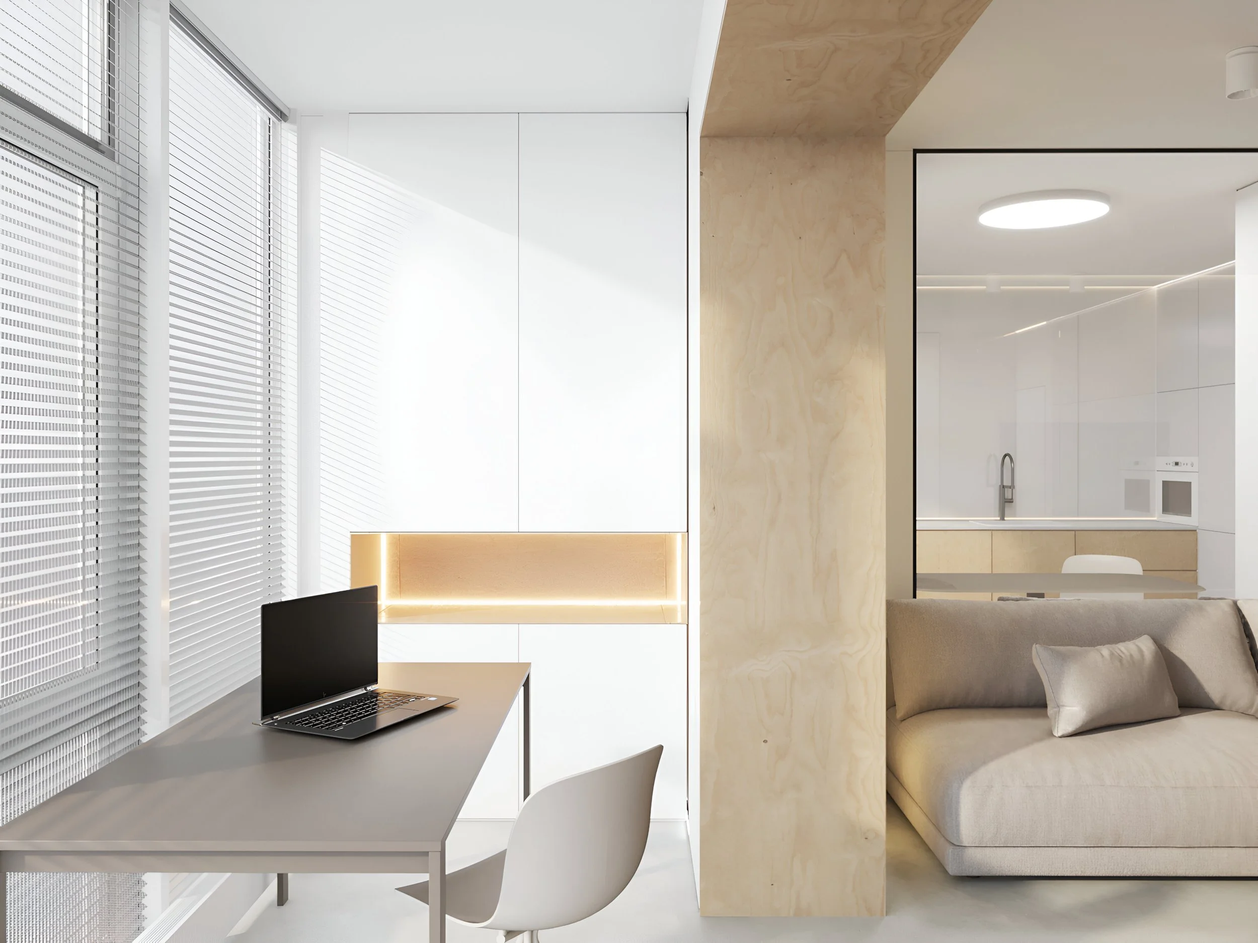 This project is a small studio apartment created especially for a young guy. The interior is dominated by white and beige shades, which give the room a light and modern atmosphere. All drawers and storage are designerly hidden to avoid visual noise and to keep the lines of the interior clean. This project combines functionality and style, perfect for a young man who spends most of his time at home working. The project was done in collaboration with Yurima Architects